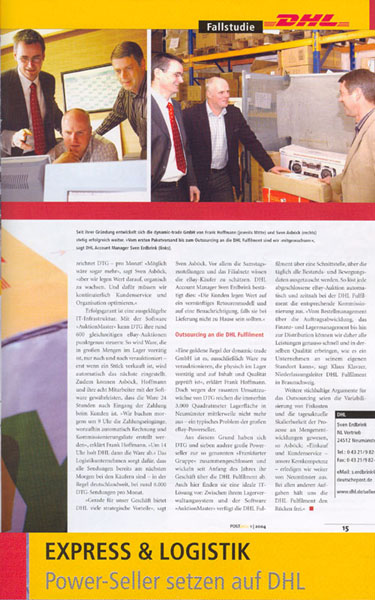 In nur einem Jahr eroberte sich die dynamic trade GmbH (DTG) aus Neumünster einen Platz unter den ganz Großen beim Online-Auktionshaus eBay. Als sogenannter Powerseller erreichte das schleswig-holsteinische Unternehmen Platin. Diese höchste Kategorie erlangen eBay-Anbieter, die während der vergangenen drei Monate durchschnittlich 5 000 Artikel verkauften oder über eine Handelumsatz von 150 000€ pro Monat erreichten. Voraussetzung ist auch, dass 98 von 100 Käufer-Bewertungen positiv sind. Für DTG war der Sprung zu Platin kein Problem. Von Null auf vier Millionen Umsatz in nur einem Jahr – Geschäftsgründer Sven Asböck und Frank Hoffmann zeigen wie es geht. Als ehemalige Mitarbeiter im Versandhaus Oppermann kennen Asböck und Hoffmann das Geschäft aus dem Effeff. “Erfahrung im Versand, in der EDV und im Kundenservice sind die Kernkompetenzen für das Online-Geschäft”, unterstreicht Sven Asböck. Beim Thema Kundenservice kommt DHL, der starke Partner von DTG, ins Gespräch. “Gerade, wenn der Kunde seine Ware bereits bezahlt hat, erwartet er, dass sie innerhalb von 24 Stunden bei ihm ist”, erläutert er den sensiblen Part der Lieferung. Über eBay bei DTG ersteigerte Ware verlässt das Lager sobald die Zahlung bei DTG eingegangen ist. Selbsttätig im Hintergrund erfasst die komplexe Software “Auktion Master” die Zahlungsabwicklung und beauftragt die Aussendung aus dem eigenen Lager in Neumünster oder aus dem Lager bei DHL Fulfilment in Braunschweig. Fertig verpackte, nachdisponierbare Artikel befindet sich seit einiger Zeit nicht mehr direkt bei DTG. Der Auktionator verschickt sie über das DHL Zentrallager in Niedersachsen. Bei den andauernden Wachstumsraten des Unternehmens achtet DTG auch darauf, dass ihr verlässliche Partner zur Seite stehen. Staubsauger, Fön, Bikini, Swimmingpool, Schlafzimmer – im Sortiment von DTG ist fast alles enthalten, was in einzelnen Posten erworben oder im Auftrag von Industrie und Handel im Internet versteigert wird. Zu den Unternehmen, die regelmäßig auf die Dienstleistung von DTG zurückgreifen, gehört auch der Lufthansa Worldshop. Bei der Auslieferung an den Kunden setzen die Neumünsteraner seit Beginn auf den bewährten Service von DHL. Etwa 80 Prozent der 600 Artikel bringt DHL dem Käufer, ausgenommen sind große sperrige Lieferungen z.B. Schrankwände. Der Logistiker DHL bietet der dynamic trade GmbH gerade für den Onlinehandel entscheidende Dienstleistungen. Sobald die Sendung das Lager verlässt teilt DTG dem Kunden die Sendungsnummer Über diese kann der Kunde den Weg seiner Lieferung lückenlos verfolgen. Ein wichtiger Punkt beim Onlineverkauf ist auch die Samstagszustellung, die für DHL-Kunden selbstverständlich ist. Last but not least bieten die vielen Filialen der Deutschen Post die ideale Voraussetzung für den Kundenservice, wenn mal etwas wider Erwarten kaputt oder nicht funktionstüchtig ist. Von der Filiale in der Nähe sendet der Kunde die Ware problemlos an DTG zurück. Reklamationen, berichtet Asböck allerdings, gibt es bei DTG selten. Eine eBay-Käufer-Bewertung von 99,8 Prozent positiv spricht für sich.